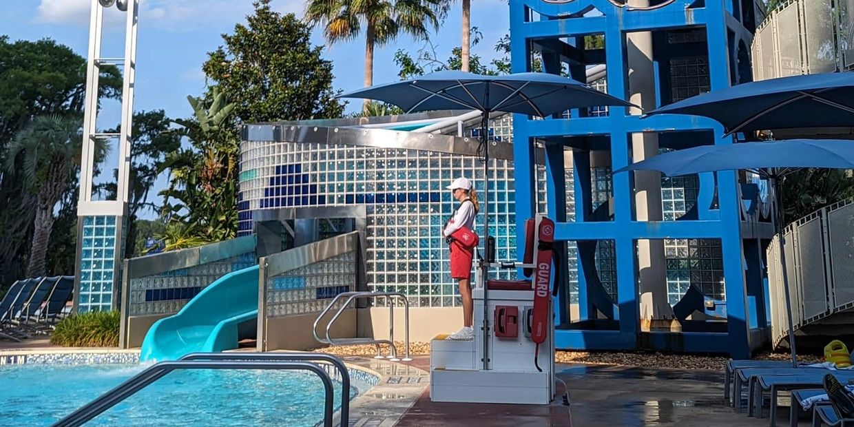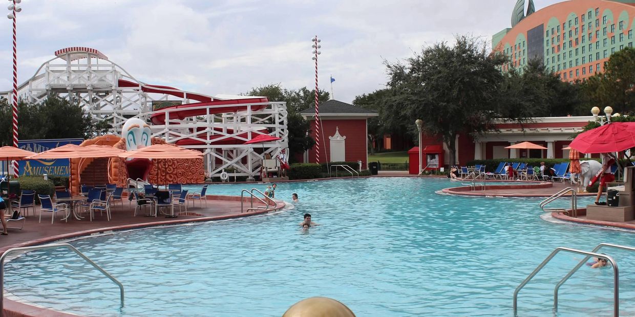 The main Beach Pool is a zero-entry pool that overlooks the Seven Seas Lagoon and features a 181 foot waterslide and waterfalls cascading over the rocks. A second pool, the Courtyard Pool, is a serene leisure pool with an adjacent whirlpool. The Beach Pool offers daily activities such as pool parties and games.