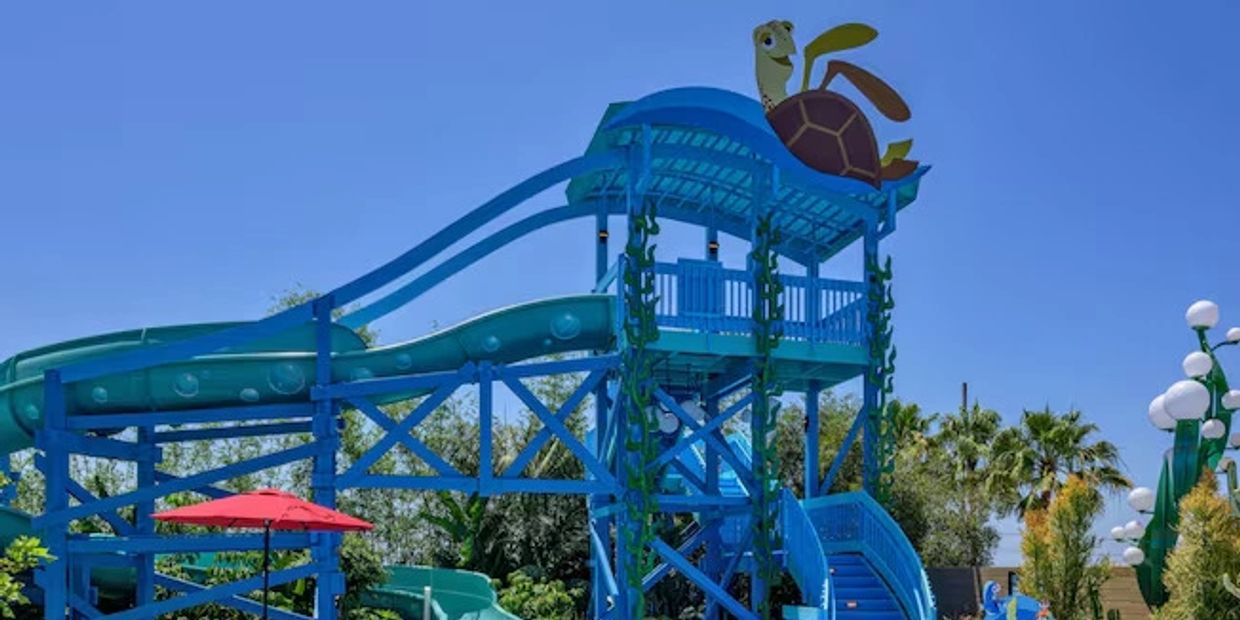 The main pool, Pixar Pool, is inspired by Nemo and his friends and is located on the third floor pool deck. This bright and colorful pool area also features a waterslide called Crush's Surfin' Slide - a nod to our most favorite aqueous reptile. Your little squirts will love Nemo's Cove, a pop jet splash pad that features characters like Hank, Squirt, Dory and marlin. You can rent private daybeds, cabanas or pods; relax in the evening around fire pits sculpted to the likeness of Elemental's Ember and Inside Out's Anger. You and your family can watch the fireworks from the pool deck on select nights.