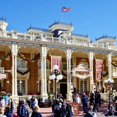 Guests entering the Magic Kingdom emerge from the tunnel under the Walt Disney World Railroad and step into the turn of the century American Main Street, U.S.A. Main Street U.S.A. was designed based on Marceline, Missouri (Walt's childhood home town). Here you can find souvenir shops, the Main Street Bakery, street entertainment (Dapper Dans), and meet the Mouse himself, Mickey Mouse in the Town Square Theater. At the end of Main Street U.S.A., you will find everyone's beloved Cinderella's Castle.